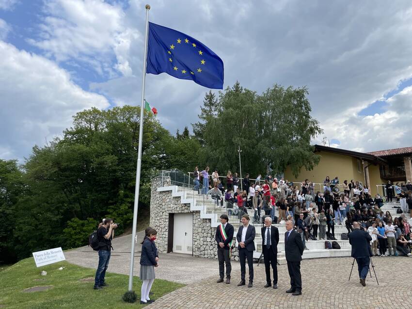 Centinaia di studenti hanno affollato l’anfiteatro della Campana dei Caduti sul Colle di Miravalle, a Rovereto, per celebrare la Festa dell'Europa. Una giornata in cui ricordare anche David Sassoli, presidente del Parlamento Europeo, a cui l'edizione 2022 della Settimana Civica è dedicata. Provenienti da Trento, Rovereto, dal Veneto, ma anche da Dublino e Sarajevo, i ragazzi hanno avuto modo di confrontarsi sui temi di interesse europeo e assistere alla cerimonia ufficiale di adesione dell’Unione Europea al Memorandum di Pace, centesima bandiera alla Campana. Ad accogliere gli studenti, insieme al Reggente della Fondazione, l’ambasciatore Marco Marsilli e al già Presidente dell’assemblea parlamentare europea, Michele Nicoletti, il Sindaco di Rovereto, Francesco Valduga.