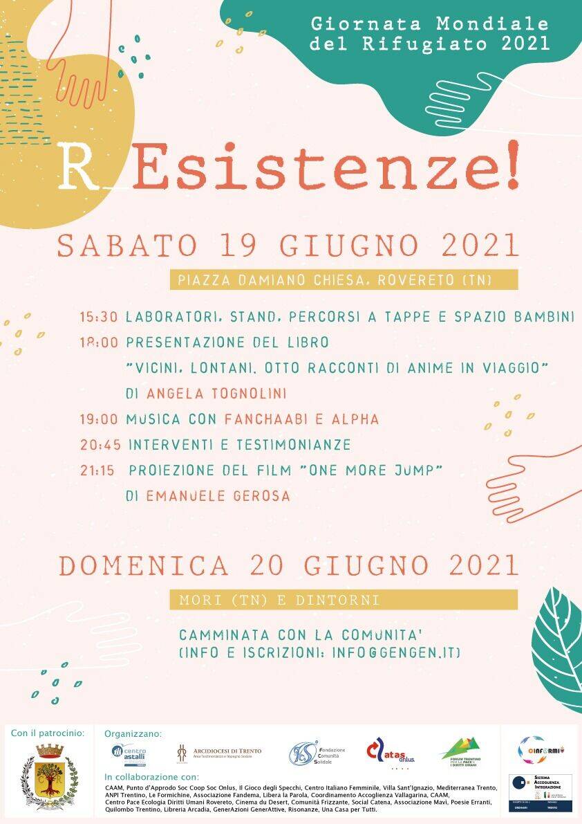 L’evento principale, si svolgerà sabato 19 giugno in Piazza Damiano Chiesa a Rovereto: alle 15.30 saranno aperti laboratori, stands, percorsi a tappe e spazio bimbi. Alle 18.00 si terrà la presentazione del libro “Vicini Lontani: otto racconti di anime in viaggio” di Angela Tognolini. Alle 19.00 musica dal vivo con Fan Chaabi e Alpha Condeore. Momento finale del sabato, alle 20.45, dopo gli interventi delle autorità e testimonianze, la proiezione da parte dell’associazione Cinema du Desert del film “One more jump” di Emanuele Gerosa.